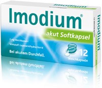 Imodium® akut, Imodium® akut lingual, Imodium® akut Softkapsel. Wirkstoff: Loperamidhydrochlorid. Zusammensetzung: Arzneil wirks. Bestandt.: 1 Hartkapsel / Schmelztbl. / Weichkapsel enth. 2 mg Loperamidhydrochlorid. Sonst. Bestandt. Hartkapsel: Lactose-Monohydrat, Maisstärke, Talkum, Magnesiumstearat, Gelatine, Farbstoffe der Kapselhülle (Titandioxid, Indigocarmin, Eisen(III)-hydroxid-oxid, Eisen(II,III)-oxid, Erythrosin). Schmelztabl.: Gelatine, Mannitol, Aspartam, Natriumhydrogencarbonat, Pfefferminz-Aroma (enth. Maltodextrin, Levomenthol). Weichkaps.: Weichkapselfüllung: Propylenglycolmonocaprylat, Propylenglycol, H2O ger. Weichkapselhülle: Gelatine, Propylenglycol, Glycerol, Farbstoff, Phospholipide (Soja), mittelkettige Triglyceride. Anwendungsgebiet: Symptomatische Behandlung akuter Diarrhöen für Jugendliche ab 12 Jahren und Erwachsene, sofern keine kausale Therapie zur Verfügung steht. Eine über 2 Tage hinausgehende Behandl. nur unter ärztl. Verordnung u. Verlaufsbeobachtung. Warnhinweis: Hartkapsel enth. Lactose. Schmelztabl. enth. Aspartam, Levomenthol. Weichkapsel. enth. Phospholipide (Soja). Gegenanzeigen: Allergie gegen Loperamid, einen der sonst. Bestandteile, Schmelztabl. zusätzl. gegen Levomenthol, Weichkapsel. zusätzl. gegen Soja, Erdnuss; Bakterielle Darmentzündung durch in die Darmwand eindringende Erreger, z. B. Salmonellen, Shigellen, Campylobacter; Zustände, bei denen e. Verlangsamung d. Darmtätigkeit wegen mögl. Folgeerscheinungen zu vermeiden ist, wie Ileus, Megacolon, toxisches Megacolon. Sofort absetzen bei Obstipation, aufgetriebenem Leib o. Ileus; Durchfälle mit Fieber und/oder blutigem Stuhl; Durchfälle während od. nach der Einnahme v. Antibiotika (pseudomembranöse [antibiotikaassoziierte] Colitis); Akuter Schub einer Colitis ulcerosa; Absolut: Kinder < 2 Jahren, nicht ohne ärztliche Verordnung: Kinder zwischen 2 u. 12 Jahren, chronische Diarrhö, bestehende od. durchgemachte Lebererkrankung (verlangsamter Abbau mögl.). Nicht empfohlen in d. Stillzeit. Schwangerschaft: Strenge Indikationsstellung. Nebenwirkungen: Häufig: Kopfschmerzen, Schwindel; Obstipation, Übelkeit, Flatulenz. Gelegentlich: Schläfrigkeit; Abdominelle Schmerzen und Beschwerden, Mundtrockenheit; Schmerzen im oberen Abdominaltrakt, Erbrechen; Dyspepsie; Hautauschlag. Selten: Überempfindlichkeitsreaktionen, anaphylaktische Reaktionen (einschließlich anaphylaktischem Schock), anaphylaktoide Reaktionen; Bewusstlosigkeit, Stupor, Bewusstseinstrübung, erhöhter Muskeltonus Koordinationsstörungen; Miosis; aufgeblähter Bauch; Ileus (einschließl. paralytischem Ileus), Megacolon (einschließl. toxischem Megacolon); Bullöse Reaktionen (einschließlich Stevens-Johnson Syndrom, toxisch epidermale Nekrolyse, Erythema multiforme), Angioödem, Urticaria, Pruritus; Harnretention; Müdigkeit; Schmelztabletten zusätzlich Glossodynie.